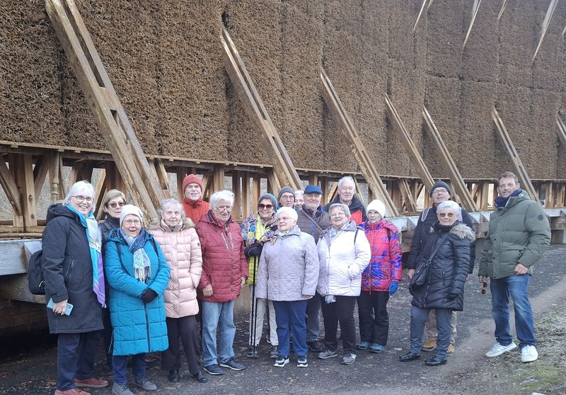 Man kann auch mal anstelle von Wandern etwas anderes unternehmen. Das sagten sich Monika Christ und Uschi Haag und organisierten am dritten Februar-Sonntag eine Planwagenfahrt durch die Hochheimer Weinberge. Das gab es schon einige Male im Herbst im Umfeld von Nierstein. Für die Winterzeit war es ein Novum. 37 Wanderfreunde – 25 Frauen, 12 Männer, davon 16 Gäste (12 w., 4 m.) – ließen sich die Fahrt nicht entgehen. In Fahrgemeinschaften ging es am späten Vormittag nach Hochheim. Am Weihergelände wurde geparkt und zunächst durch die Altstadt zum Weingut Preis spaziert zur Einnahme des Mittagessens. In gemütlicher Atmosphäre mundete allen, so wurde dem Schreiber dieser Zeilen berichtet, die „solide Hausmannskost“ und ließ Vorfreude auf das weitere Geschehen aufkommen. Im Vorgriff darauf dankte Bernd Löffler den beiden Ausrichterinnen mit lobenden Worten für ihre Initiative. Um 14.30 Uhr standen dann zwei Planwagen, gezogen von Traktoren, bereit. Die Fahrt konnte beginnen. Bei weitgehend sonnigem Wetter aber Kältegraden ging es in die kahlen Weinberge in Richtung Flörsheim bis zur Keramag. Die Kälte in den beiden Wagen wurde etwas abgemildert durch Wolldecken, mit denen man sich einhüllen konnte. Natürlich trug auch der Wein, der neben Traubensaft und Mineralwasser käuflich erworben werden konnte, zur Erwärmung bei. Zudem spendierten die Ausrichterinnen auch noch Knabbergebäck. Das alles trug zu einer guten Stimmung bei. Mit dem Blick nach Draußen konnte man den gemächlich fließenden Main in Augenschein nehmen oder den Taunus bis hin zum Feldberg. Eine Pause wurde am Denkmal zu Ehren der englischen Königin Viktoria eingelegt, das 1854 errichtet und unlängst renoviert wurde. Zurück ging es dann vorbei am Bahnhof und an der Kirche St. Peter und Paul bis zu den geparkten Autos. Schön wäre es gewesen, war allenthalben zu hören.