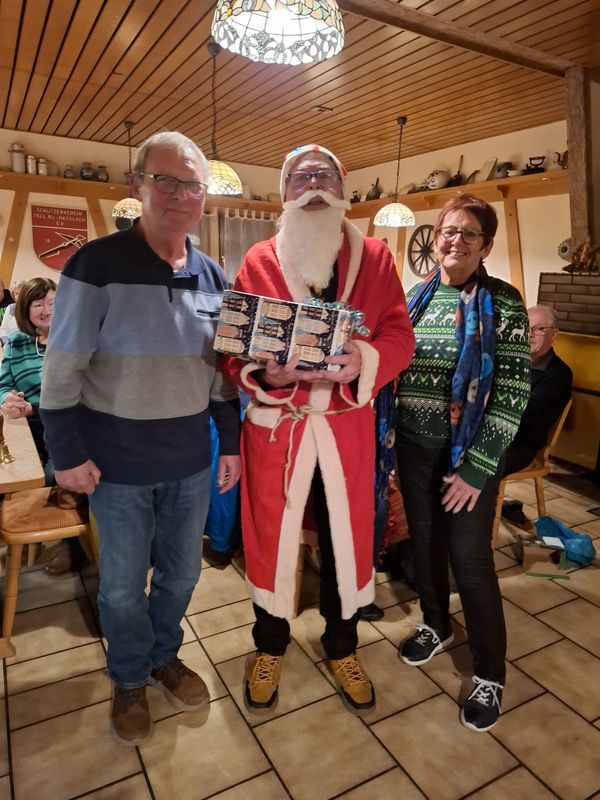 Wie in alten Zeiten wurde das Wanderjahr 2025 beschlossen. Just am Nikolaustag trafen sich dazu unsere Wanderer und mehrere Gäste. Es fing damit an, dass man sich am frühen Nachmittag im äußerst gepflegten Schrebergarten von Gudrun und Harald Imschweiler in Königstädten traf. Sie verfügen dort über ein Refugium zum Wohlfühlen, wo das Verweilen trotz nasskalter Witterung Spaß machte. Selbst gebackene Plätzchen, andere Leckereien und Getränke, hauptsächlich Glühwein, trugen mit dazu bei. Nach über einer Stunde unternahm die Mehrzahl der Teilnehmer eine kleine Wanderung. Der zweite Teil des Treffens fand im „Schützenhaus“ hinter dem Tierheim statt. Dort fanden sich nach 17 Uhr unter den 46 Gekommenen – 27 Frauen, 19 Männer, davon 15 Gäste (10 w., 5 m.) – auch einige ein, die zuvor nicht dabei sein konnten. In behaglicher Atmosphäre ging die Zeit bis zum Aufbruch, beginnend nach 20 Uhr, schnell vorbei. Wird auch wieder der Nikolaus vorbeischauen, war die spannende Frage. Pünktlich um 19 Uhr kam er mit seinem Schlitten voll Geschenken und zeigte sich wieder gut in Form. Er hatte kaum etwas zu kritisieren und lobte die eingespielten Mechanismen bei der Wanderabteilung. Die Wanderungen des Jahres ließ er Revue passieren. 525 Personen hätten daran teilgenommen, die stolze Zahl von 44 pro Angebot. Für deren Ausrichter hatte er Geschenke dabei, ebenso für den/die Verfasser von Berichten. Geehrt wurde Hans-Dieter Blos für die Teilnahme an 100 Wanderungen. Doch auch der Nikolaus alias Bernd Löffler und seine Frau Hannelore gingen nicht leer aus. Sie überraschte für ihre vorbildliche Arbeit Lothar Flach, stellv. Leiter der Wanderabteilung, mit einem Geschenk. Auch Weihnachtslieder wurden gesungen und an Gesprächsstoff mangelte es eh nicht. Zum Schluss wurden nach einer Unterbrechung im Vorjahr auch die Portmonees geöffnet für einen guten Zweck: Eine Summe von 190,00 Euro kam zusammen, die noch aufgerundet wird.